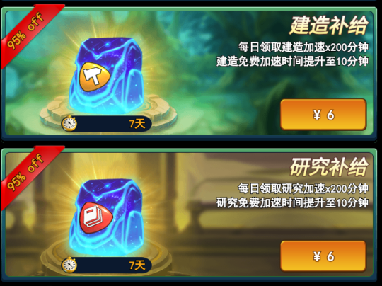 当然,有实力的统帅也可以通过特权补给站里各花费6元购买特权,可以将建造和研究免费加速延长至10分钟,但零氪党也不用担心,在游戏开荒期免费加速5分钟是完全够用的。