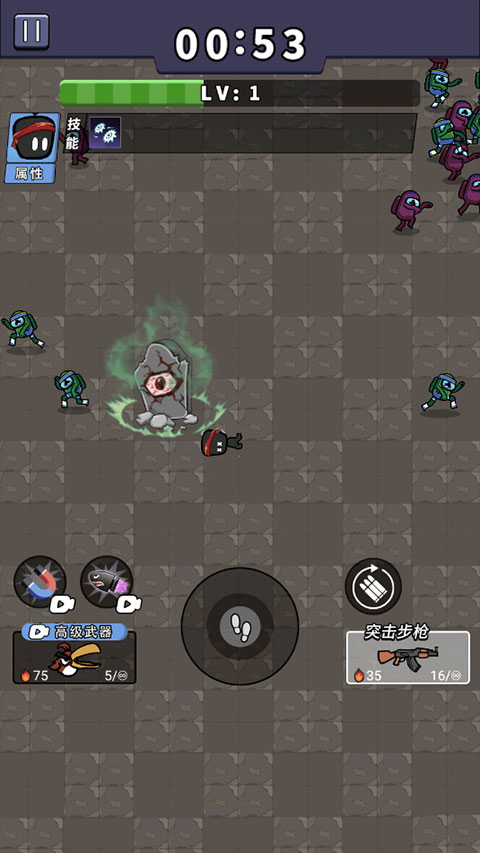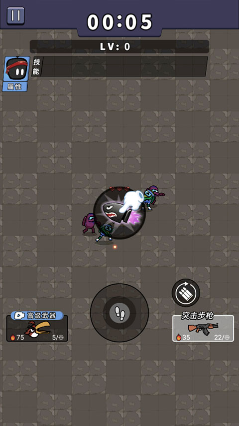 3、滑动中心按钮躲避敌人的攻击,与他们保持一定的距离,英雄会自动射击、自动刷新子弹;