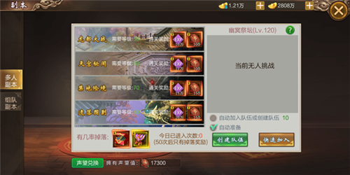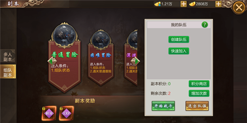 1.游戏中的多人副本,可单人可组队,但单人耗时长挑战难度大,且组队最多限制为3人,组满3人可大大加快通关速度,并且还可获得额外声望奖励。