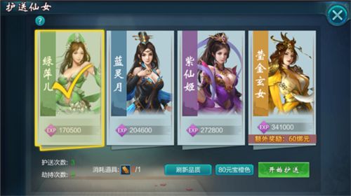 2.玩家前往吉祥天场景内移动到护送NPC处,通过使用护送令刷新品质的方式,可护送不同品质的美女,品质越高奖励越好,刷出橙色品质还可获得额外绑定元宝奖励;