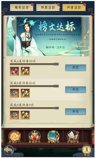 除了每日、每周任务外,最重要的就是月度任务了,月度任务的奖励十分丰厚,月度任务一般有3个:英雄进阶、榜文达标和名扬四海。