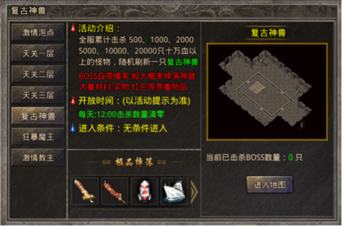 5、复古神兽:全服累计击杀500、1000、2000、5000、10000、20000只10万血以上的怪物,随机刷新一直复古神兽。BOSS自带爆率,极大概率掉落神器大量材料,实物,红包等物品。开放时间:以活动提示为准,每天12:00击杀数量清零,无条件进入