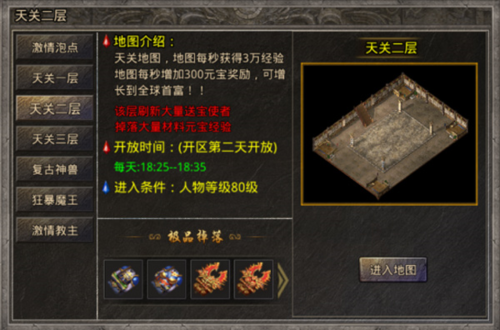4、天关三层:击杀BOSS地图,掉落大量元宝装备材料经验券,击杀BOSS获得大量奖励,开区之后的第二天开放,在每天的22:25-22:35开放进入,进入条件人物转生达到4转可进入