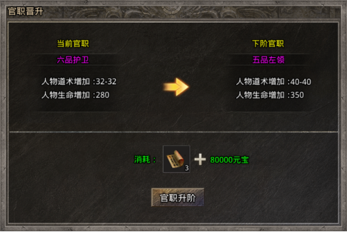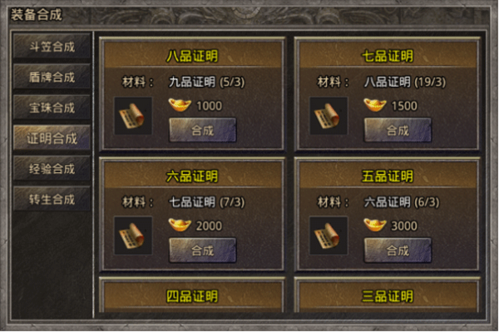 证明合成:升级自己在游戏内的官职需要使用到证明,在装备合成页面中提供证明合成的功能,使用低品官职证明和元宝可以合成高品官职证明