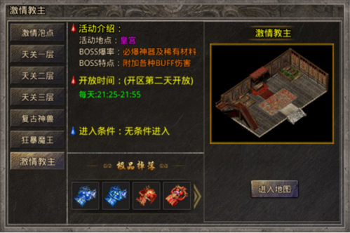 7、激情教主:必爆神器及稀有材料,附加各种BUFF伤害,开区第二天开放,每天21:25-21:55开放,无条件进入