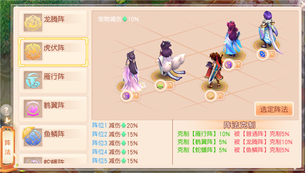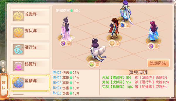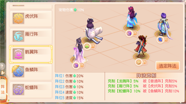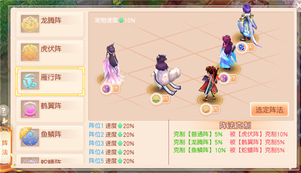各方面都有加成,这套阵法一般是三辅助队伍首选,物理4位置拥有伤害25%加成。阵法缺点:3号位速度提升10%还是加成比较低的,被鹤翼大克是其最大的悲哀,鹤翼阵在PK中使用率很高。
