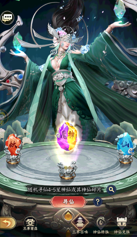 二、获得神仙的主要途径是寻仙和三界召唤,寻仙分为天界寻仙、下界寻仙和仙缘寻仙三个卡池,三个卡池获得的神仙品质不尽相同,可以消耗仙玉、仙缘点或者寻仙令召唤神仙。