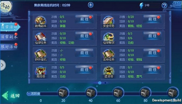 1、【每日活跃】:可以通过点击日常按钮,进入到日常活动界面,道友们可以通过完成日常活动获得活跃度,达到不同的活跃度可以获得活跃金币包,目前是20活跃、60活跃、100活跃都会有活跃金币包,每个金币包可以获得3000金币,完成到100活跃一共可以获得9000金币。