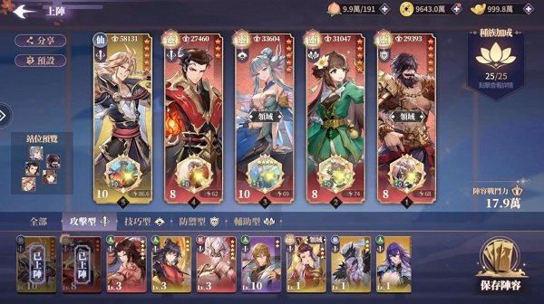 玩家前期大可以随意将自己喜爱的角色放在队伍中培养,随著关卡难度越来越高,除了平衡提升战力以外开始研究角色之间的互补变会显现出所有人之间的队伍强度差距,在其他条件完全相等的情况下,只要将角色配置的概念弄懂,不需要达到完美配阵也能够有明显的提升。根据游戏中角色特性可以将他们大致分为“坦克”、“输出”、“辅助”、“控制”四个位置(可从灵将详情中攻略查看灵将特色)。