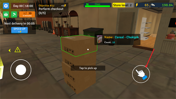 2、当货物配送到门口时,点击即可拾取,将货物搬运至货柜附近进行摆放。