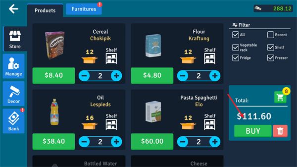 2、供应商品:利用游戏内系统订购库存、拆包交货以及储存货架、冰箱和冷冻库。