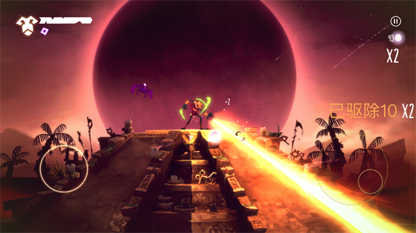 4、角色射出的光线对低等级的杂兵具有穿透能力,一次能消灭多个敌人,但中后期出现的高级敌人能够阻挡光线,对付起来要麻烦一些,这时候最好用咒术攻击辅助消灭靠近的敌人,否则很容因为受伤而导致连击中断,从而影响获得的分数。