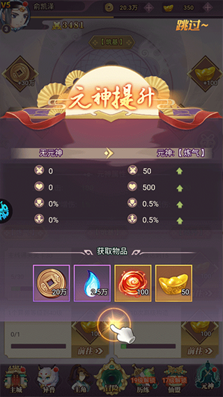 5、元神提升可以提升主角战力,并且可以获取大量道具奖励。