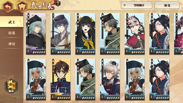 2、之后就可以在武士列表查看刚刚抽取的武士英雄啦,有材料的话也可以先将高阶英雄进行升级培养。