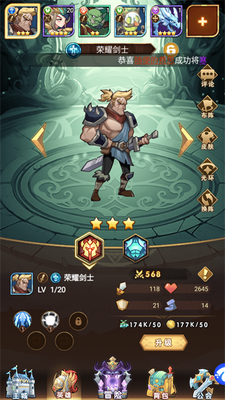 1、作为放置类游戏,最为关键的就是抽卡,大家可以在主城的英雄召唤处招募处抽取心仪的英雄哦;