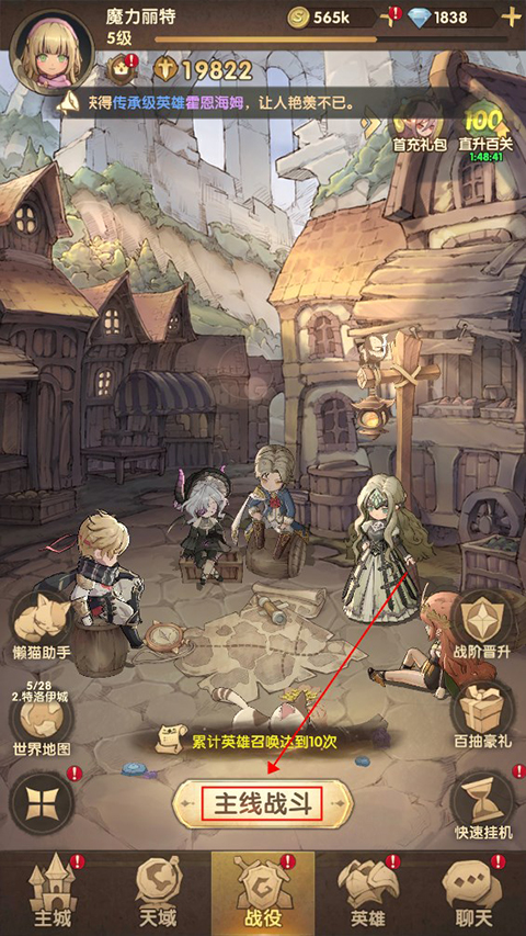 2、进入战斗前,可以先配置一下队伍,将高等级、品质英雄上阵,快速击败敌人。