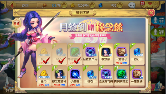 签到可以说是每天登陆游戏后第一件要做的事情。在每个自然月内,玩家每天都可签到一次获得不同的游戏道具奖励。累计签满一个月好能获得英雄奖励哦!