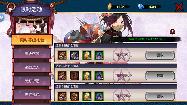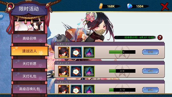 【七日庆典】每日福利处可以领取大量强力4星英雄碎片,福利拿到手软。第二天登录即送5星英雄「封魔小太郎」,第三天登录即送5星英雄「真田幸村」。