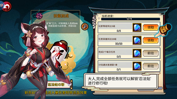 8、完成指定的修行任务可以获得相应的钻石,把对应的修行任务全部完成的话,就能解锁对应的忍法帖给自己的队伍带来十分可观的BUFF加成哦。这些任务相信对各位大人来说一定都是小菜一碟,不断完成新的任务,解锁更加强力的忍法帖吧。