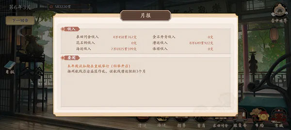 5、无脑刷关服,然后看有没有地卖 最理想4个勾拦一个质库 这个时候就可以无脑刷下个月。然后开漕运。漕运刷完之后就差不多可以刷海运了。