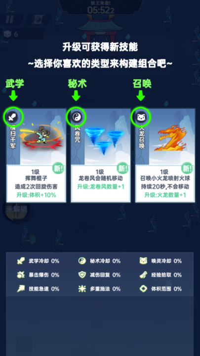 3、战斗前可以选择学习心法,每种心法都有自己独特的加成,帮助你完成更多割草生存挑战。