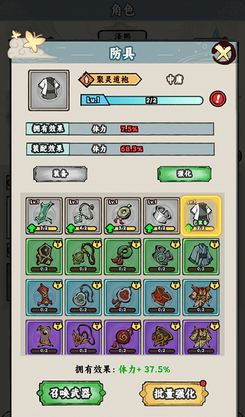 2、装备:游戏内有着武器、防具、法宝等六种装备,玩家可以注意解锁进行穿戴,提高角色基础战力。