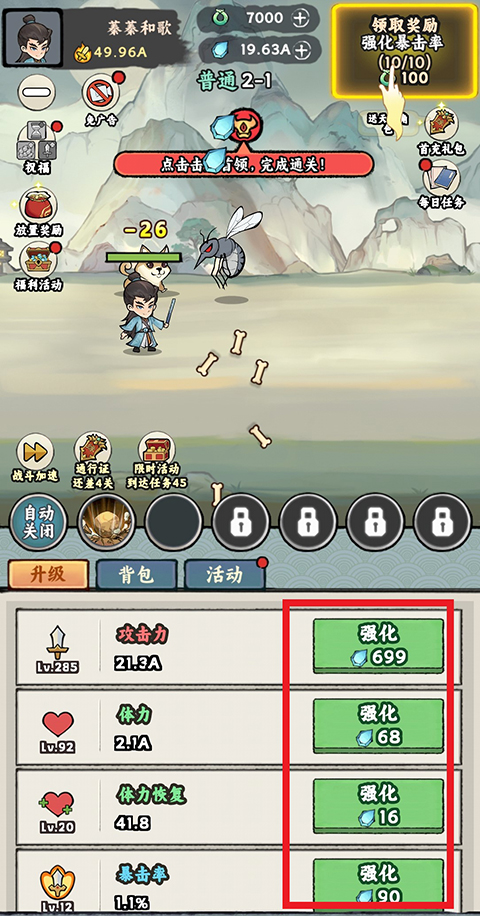 1、升级:游戏的角色系统是最主要的玩法系统,玩家可以对角色的攻击力、体力、暴击率等属性进行升级提升。