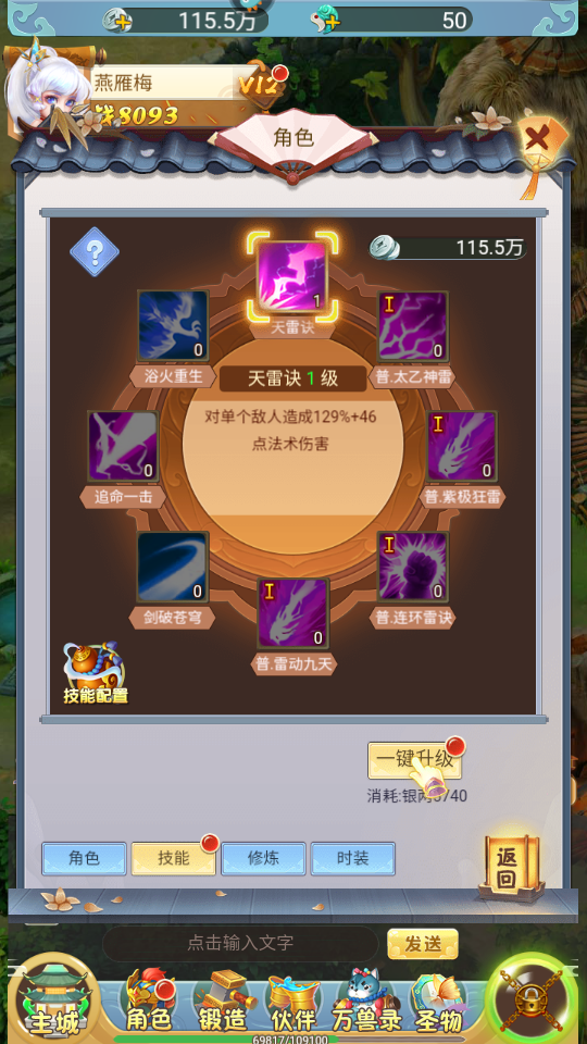 5、点开角色,还可以学习技能,点击一键升级即可,可以大大增强战斗力;