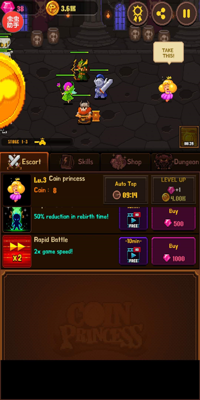 总体来说,游戏的玩法并不是很难,点击界面可获的金币,但这个等级与公主的等级息息相关,而根据解锁的技能,可为你缓解很多压力,例如攻击力、防御力的提升,治疗效果,以及金币翻滚等等。