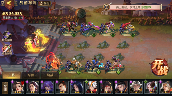 塔防模式,只能使用远程攻击武将,谋士和弓手,高台不会收到伤害,这边建议玩家全都使用高输出武将
