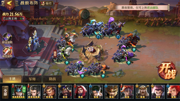 助战吕布马超吃张辽攻击提升BUFF作为主力输出,马腾取消西凉铁骑的组合限制极大程度提高西凉轻骑的能力,公孙瓒制造破甲效果。颜良增益马云禄马岱的召唤物,荀彧给阿斗回血还能加护盾。