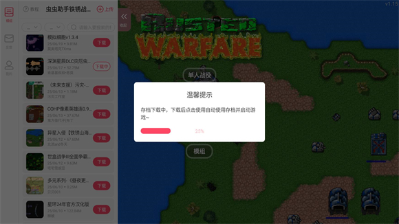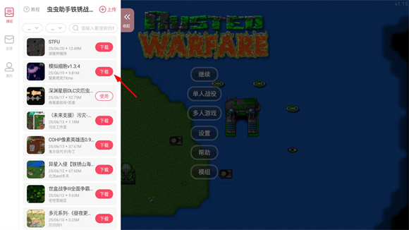 铁锈战争内置MOD菜单(Rusted Warfare)是内置有各种模组的版本,在这个版本里玩家不用再下载模组文件进行复杂的操作,只需要点击一下按钮就可以轻松下载模组来游玩。