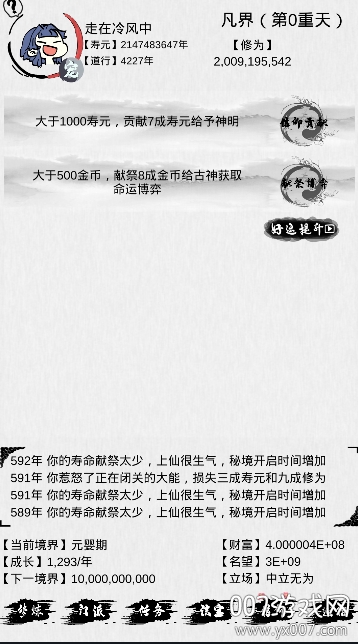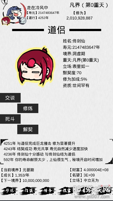 一款非常好玩的文字修仙游戏,完美修改破解,修改大量修为、大量财富 、大量声望、最大寿命值,解锁灵宠、道侣等,额昂你挂机修炼更轻松。