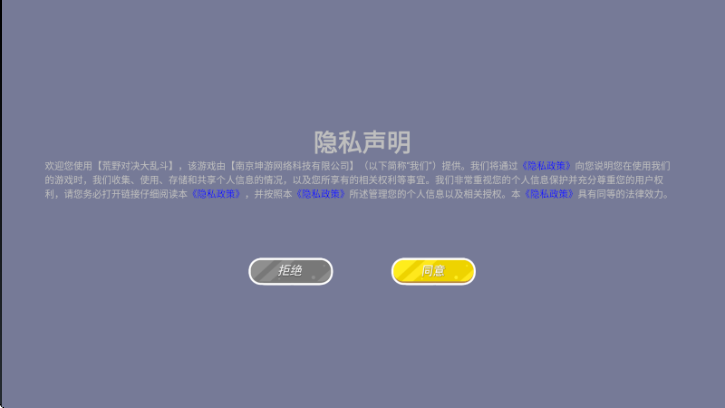 1、下载荒野对决大乱斗游戏,查看服务及隐私协议文件,点同意按钮就能进入游戏页面。