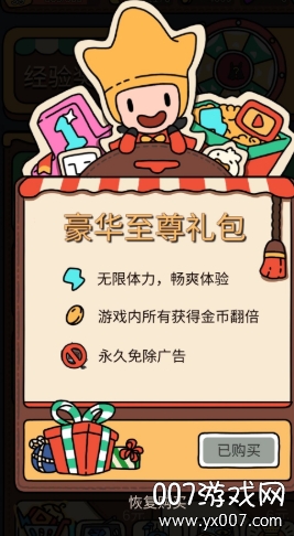 至尊豪华礼包购买之后能够永久的去除广告,还有无限的体力可以用,最重要的是游戏中的金币全都翻倍了,但是有些玩家们购买之后发现体力没有无限,广告依然还有,大家可以推出游戏重新开启。