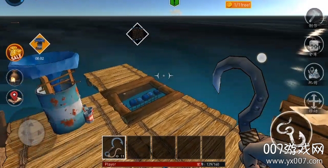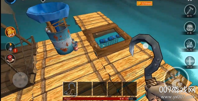 1、开始就身处在一个漂浮在海上的小木筏上,靠着钩子钩各种从海上漂浮的东西中获得材料。