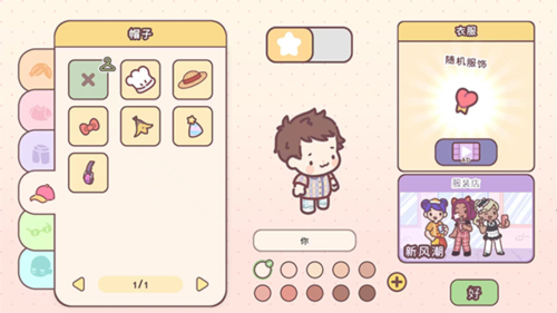 6、点击左下角【小人物】图标,进入装扮界面,包括发型、衣服、裤子、帽子、眼镜、颜色等装扮元素,