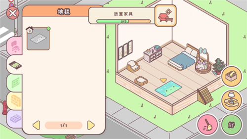 9、点击右下角【家具】图标,进入家具界面,可选择家具、地毯、墙饰、地砖等进行放置,