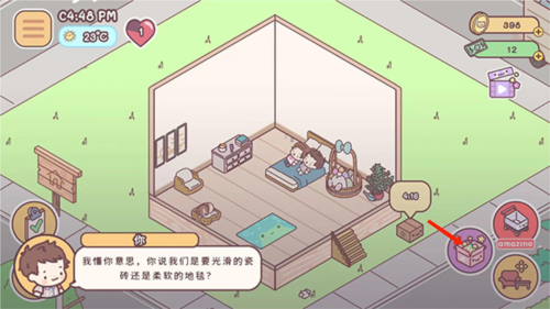 4、进入游戏主界面按照提示,拖动盆栽、沙发和柜子,移动到指定的位置,完成新手任务后,就是自己来布置这个有爱的小家了,