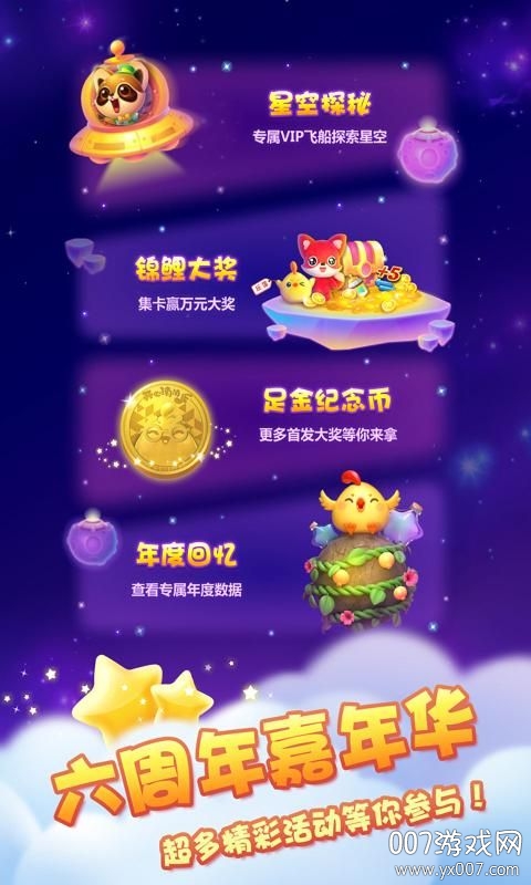 很多时候我会第一时间向大家推荐开心消消乐六周年狂欢版,这款是年度的最新版本,不但延续了前面的优势,还加入了六周年活动,比如坐专属飞船、查看你的年度数据、闯关集卡赢大奖等,让每个小伙伴玩起来更加带劲。