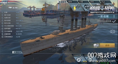 右上角有四个基础配件,我们可以通过将配件全部强化后,点击右侧的进阶,将战舰进阶,而在下方的一排,是我们的武器列表,在战舰达到指定阶级的时候,就可以开放对应的武器位。
