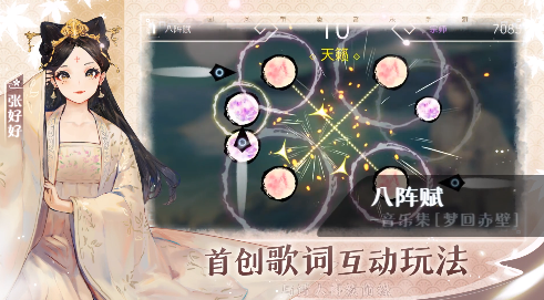 《阳春艺曲》是一款结合中国古典诗词的新国风音乐节奏游戏。以诗入歌,首创重视歌词互动,将古典诗词融入游戏中,随着音乐节奏点击诗词,或如书法般画出文字。玩家在游玩中,体会诗词文字之美。多主角多线故事模式,重现历史典故,再现经典感动。