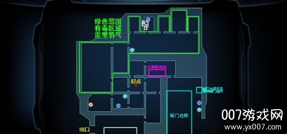 玩家想要探索毒气区要先获得氧气补给,小伙伴们需要先去在地图南边标示的那块区域,调查机器获取氧气瓶。因为携带氧气瓶会触发工厂防盗不可以原路反回,所以要用房间中的传送带转移,等回到带有闸门仓库的房间再重新拾取,同时携带上限4瓶,不需要其他东西了。