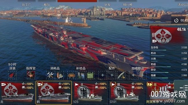 航母没有炮弹火力,只有飞机,胜败关键,所以永远是最后方的保护对象,玩家需要非常注意隐蔽。
