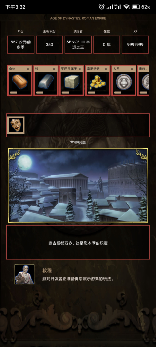 王朝时代罗马帝国游戏是一款非常不错的回合制策略战争类手游,该游戏背景发生在罗马帝国,由于很多暴君的反抗,让帝国变得不再安宁,因此玩家在游戏中将化身为罗马帝国的统治者,你将在游戏中经历一个王朝的完整时代,并且掌控着国家的各项指标,你需要让明君做出正确的选择,努力让王朝变得更加强大,减少那些暴君的愚蠢决定,或者让他被推翻更换下一位领导者,从而改写罗马帝国的历史,阻止自己的帝国走向衰亡。另外该游戏的玩法主要以故事剧情为主,玩家的各种决定都将改变罗马帝国的发展,整个王朝的命运都由你来决定。
