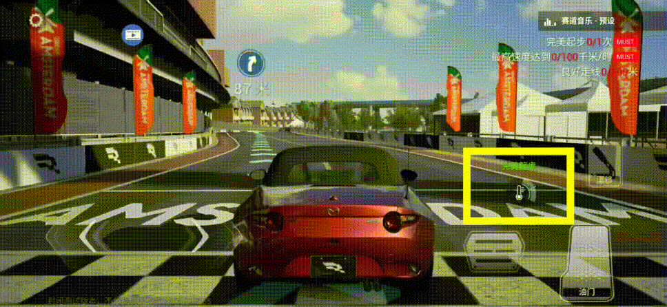 想要达到完美起步,就需要在起步倒计时阶段,按下油门键改变指针,当倒计时结束,指针停留在右下角表盘里的白色区域时,就可以让车辆触发「完美起步」,这时车辆的起步速度将会得到提升!
