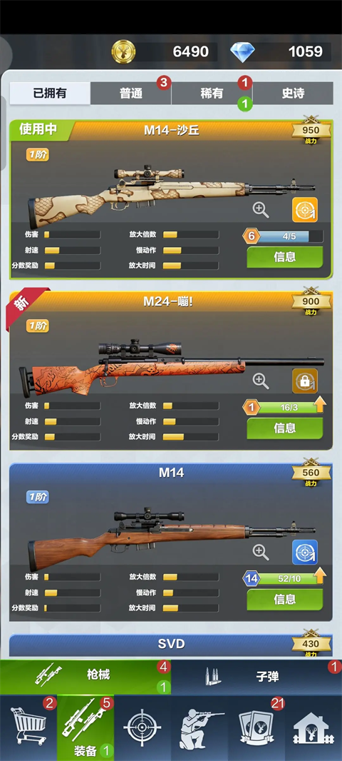 分为枪械和子弹界面,这里能够查看枪械和子弹的具体信息以及获取条件,后续的保养升级都在此处。