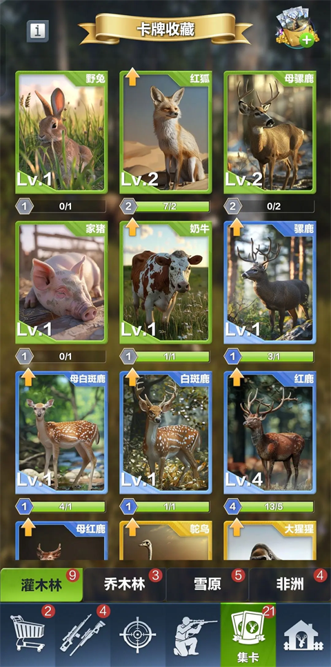 每次狩猎可获取卡牌碎片解锁动物卡牌,每张卡牌都有不同的卡牌加成能力,升级卡牌可以提升卡牌技能,在猎友们狩猎结束时能提供更多分数。