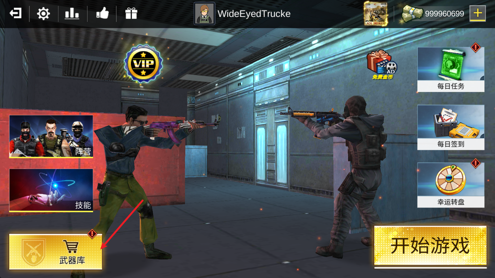 1、提升战斗力首当其冲的就是武器,点击左下角武器库。