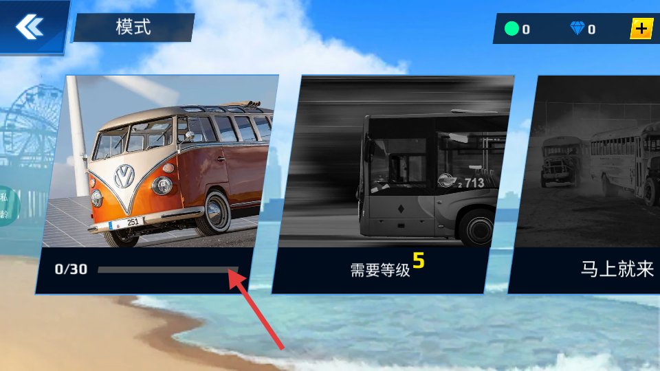 2、模式界面,先玩【0/30】进度的复古巴士模式,积累等级,解锁后续等级5模式。